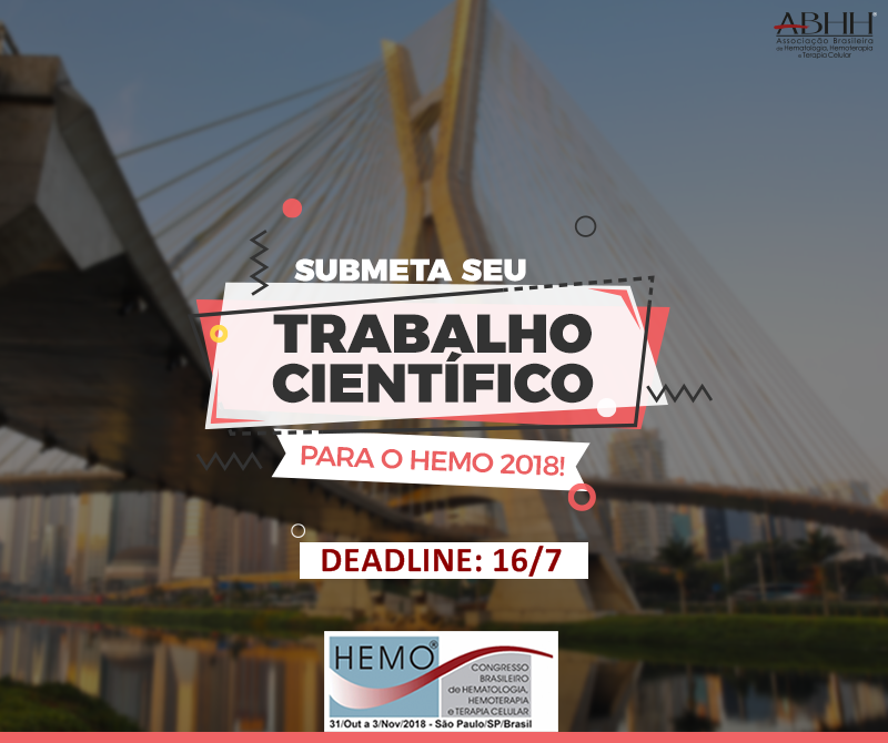 Você já pode submeter seu trabalho científico para o HEMO 2018. Para isso é necessário que esteja inscrito no evento e acesse a área restrita do site, com o login e senha cadastrado. Logo após, basta selecionar a opção de “Trabalho Científico”. A data limite de submissão de trabalhos será até o dia 5 de julho de 2018. Durante o Congresso, serão premiados os melhores trabalhos sobre temas fundamentais da especialidade nas seguintes categorias: