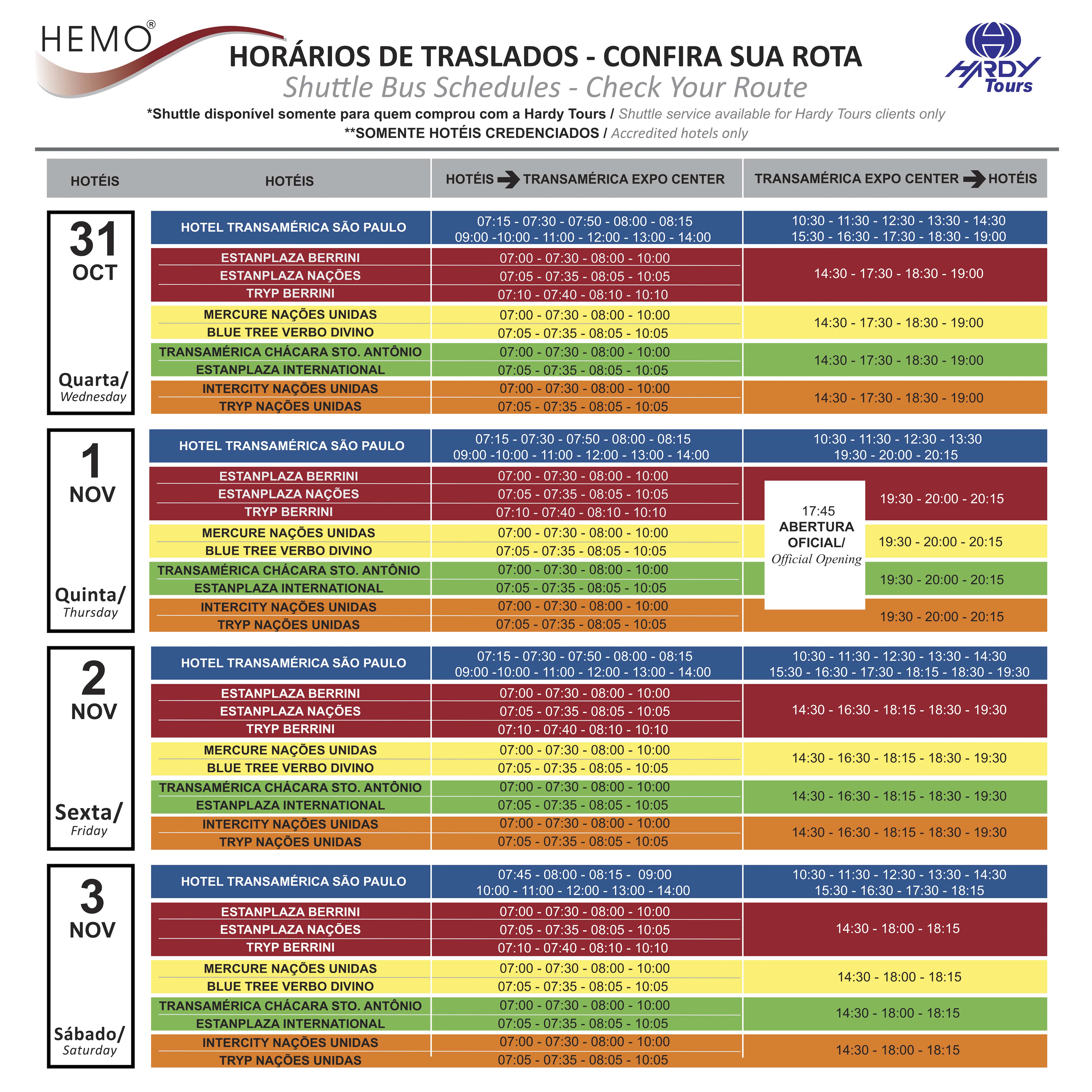Somente os participantes que adquirirem a hospedagem com a Hardy tours terão direito ao serviço de shuttle hotéis credenciados / local do evento / hotéis credenciados.